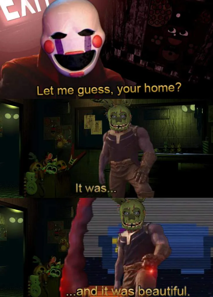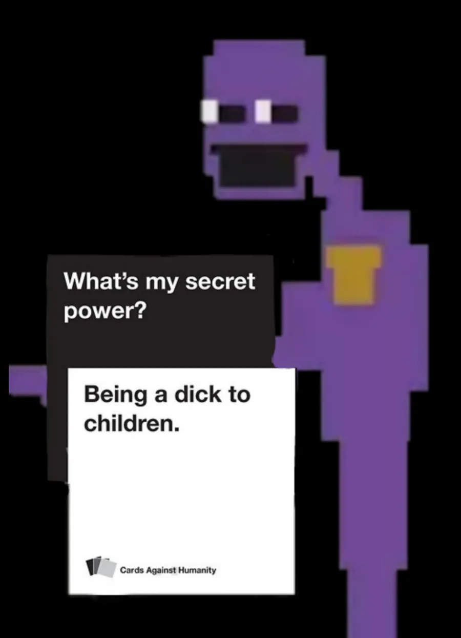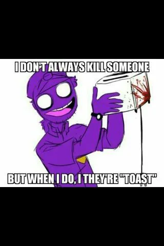 I just realized something horrible you know Freddy is going to smash soon maybe but Waluigi is purple and you know who else is purple is purple guy it makes sense y.(Scott hits him over the head with a tense racket )Scott:He knows too much