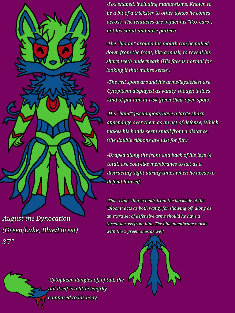 As for my second dynocation, this is August! He's, well, a self insert I guess lol. He's a nomadic fighter, utilizing the membrane "cape" he's made as secondary arms when needed. Forgot to mention in the Deacon post both they are both amoebas!