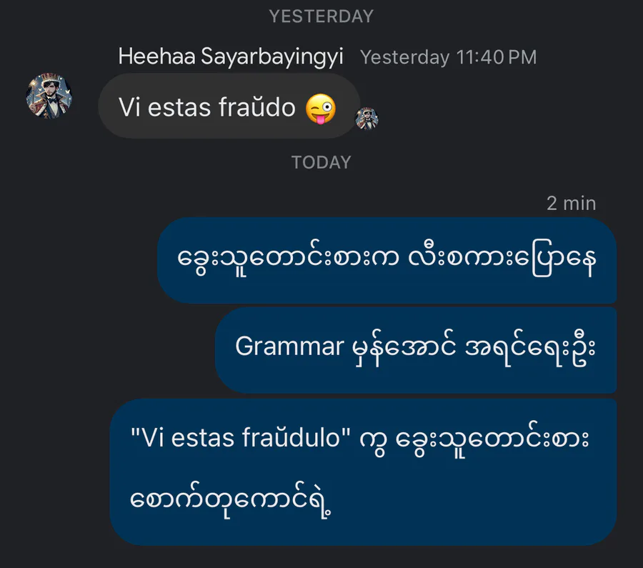 စောက်တုခွေးက မတောက်တခေါက် Esperanto စကေးနဲ့ ငါ့လာစမ်းနေတယ်၊ Grammar လည်း မမှန်ပဲနဲ့၊ ဘာသာစကားတစ်ခုမှာ Grammar မမှန်ရင် အလကားပဲကွ၊ ဘက်စုံညံ့ဖျင်းတဲ့ ဟီးဟားအစုတ်အပြတ်ကောင်ပါလားနော်၊ သနားစရာပဲ 🙂↔️