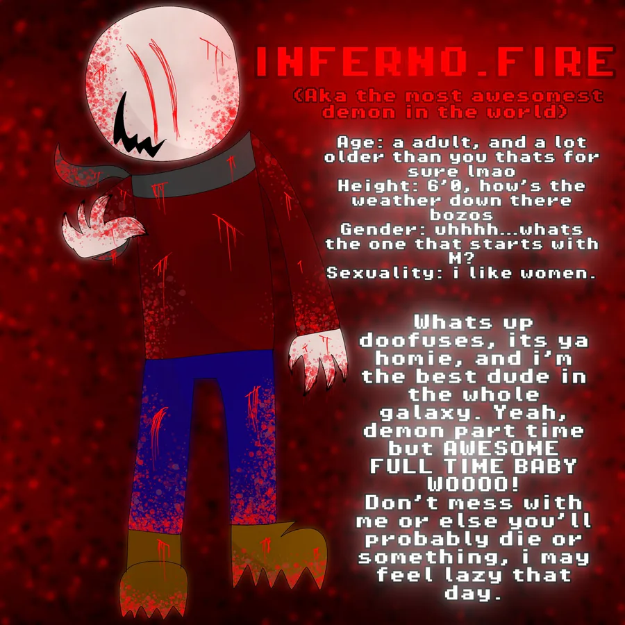 I’m Inferno, i’m a game developer/artist/musician, i draw usually whatever i think of drawing and i help other people out with whatever they are doing, or just joke around with them