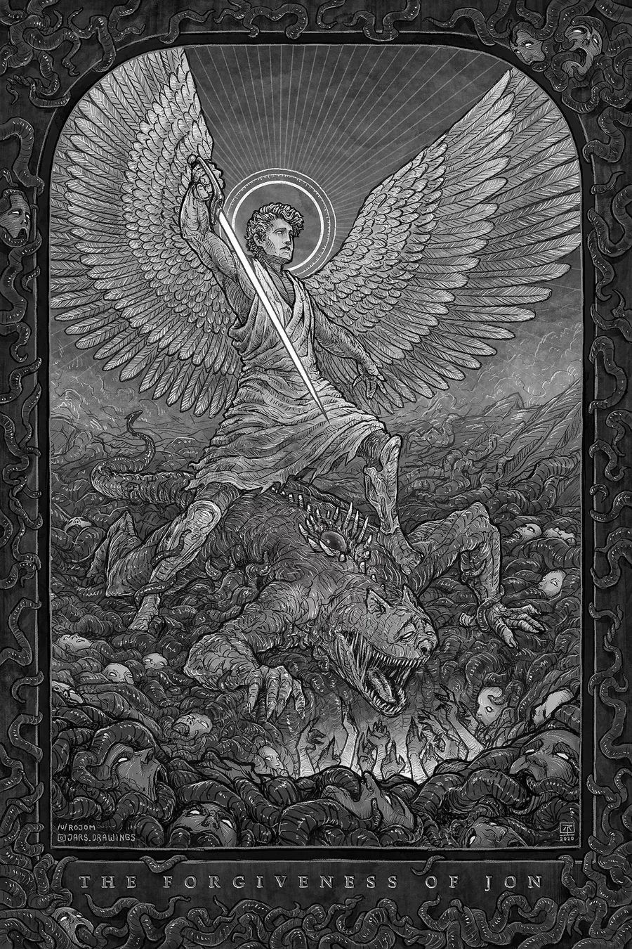 JESUS THERES NO FUCKING WAY AN ART OF JON AS AN ANGEL KILLING GOREFIELD IS GONNA MAKE ME SOB UGLY 😦😦😦 (id explain why but i dont have the space)