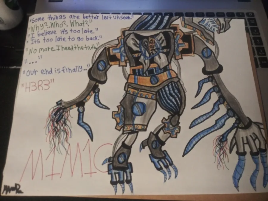 Time to post oh boy.. but regardless this is M1M1C. A steampunk robot modelled after a raven. The head is currently not visible in this shot for now. Nonetheless, M1M1C can record, and then copy human voices, similar to Ennard.. and it can hold grudges...