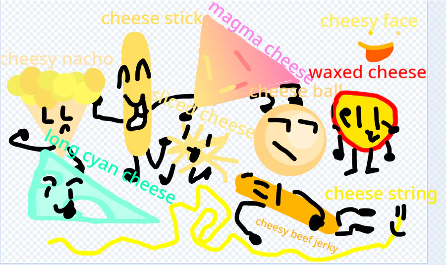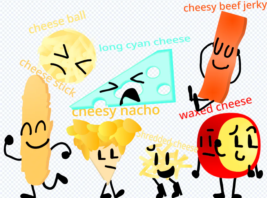 welcome to the cheesy games. these 10 cheese related objects are battling to be my next oc! vote to safe your favourite cheesy fella! the one who gets the least votes get crushed ! goodbye and happy voting oh yeah also assets will get better each episode