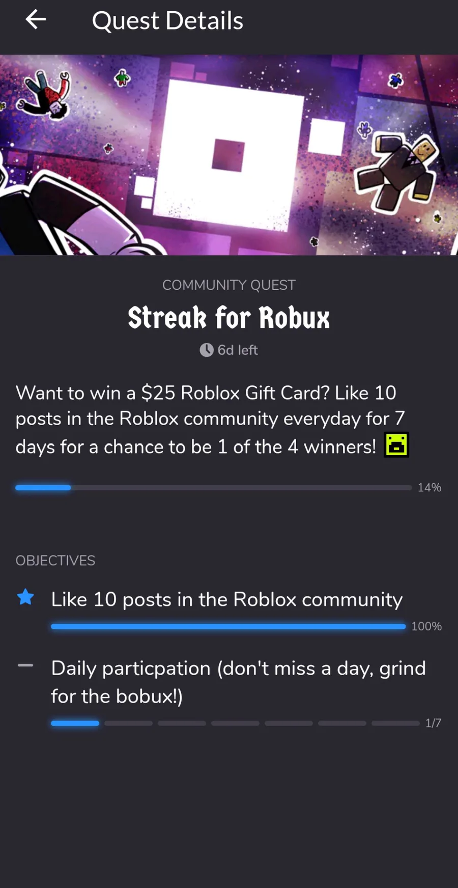 Tap that glowy Quest icon on the top right corner of the screen (hint: it looks like a scroll) and complete the daily objectives for a chance to win a $25 Robux Gift Card!