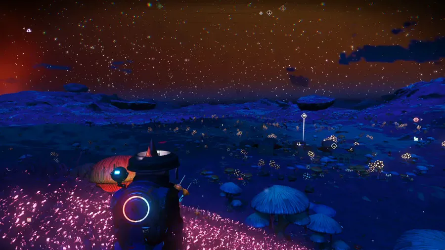 Initially, I was upset that an update changed my beautiful yellow open grassland planet into a mauve mushroom planet, but then nighttime rolled around, and... I'm not upset anymore. (*o* ) So pretty~