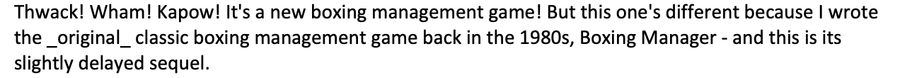 Thwack! Wham! Kapow! It's a new boxing management game! But this one's different because I wrote the _original_ classic boxing management game back in the 1980s, Boxing Manager - and this is its slightly delayed sequel.