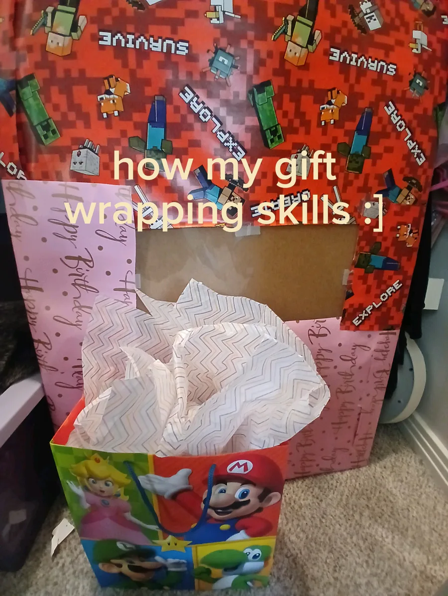 Today's mission make the gift wrapping/ bag not match with the party theme >:]