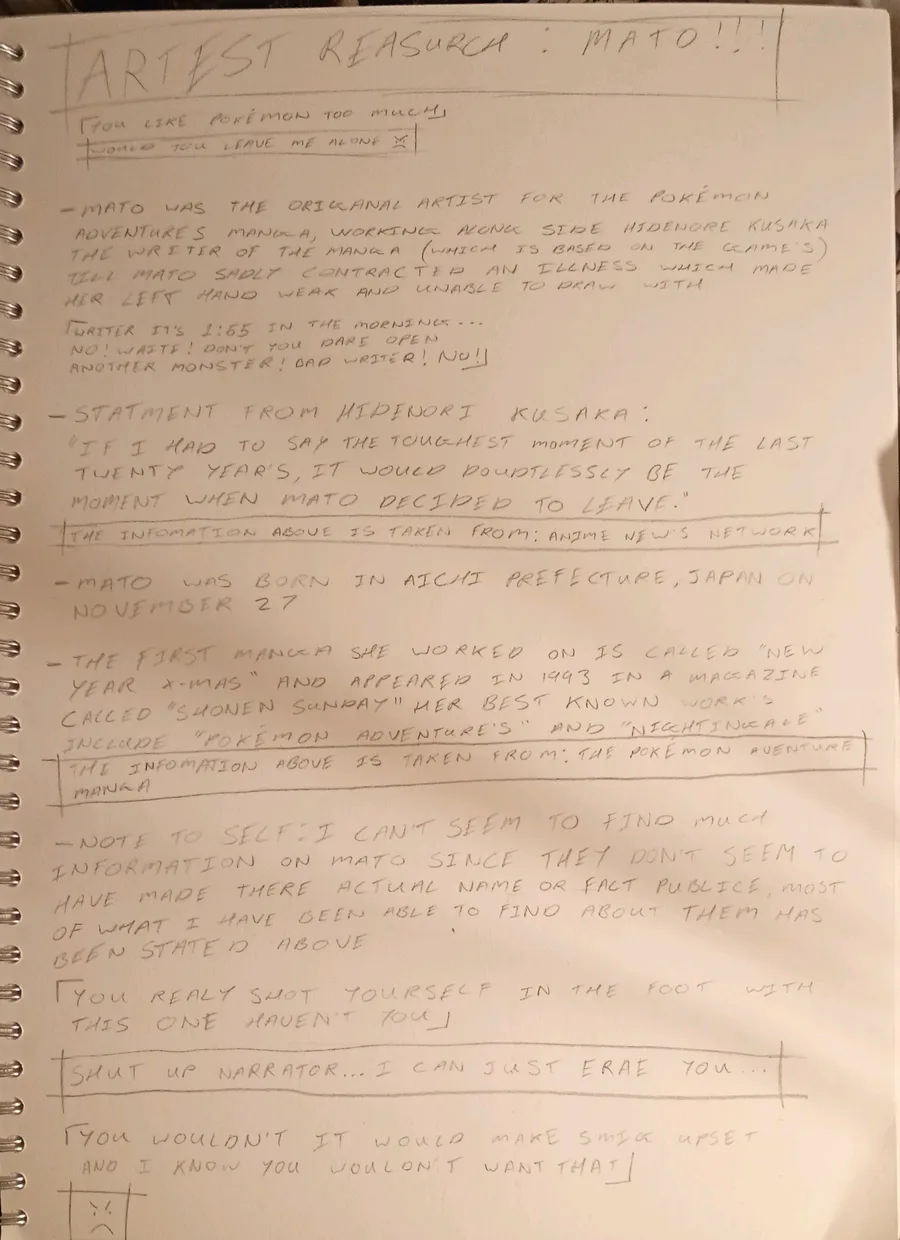 Sorry if this isn't readable I've got some real shaky hands but anyway I'm progressing on my FMP this is some artist research on mato the artist for the Pokémon adventure manga!!! :)