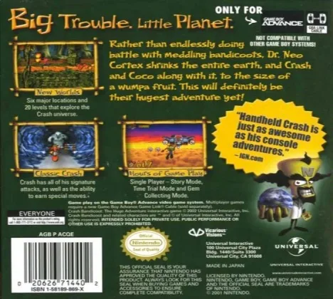 Crash Bandicoot : The Huge Adventure 2002 (Game Boy Advance) Game.