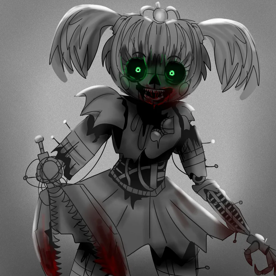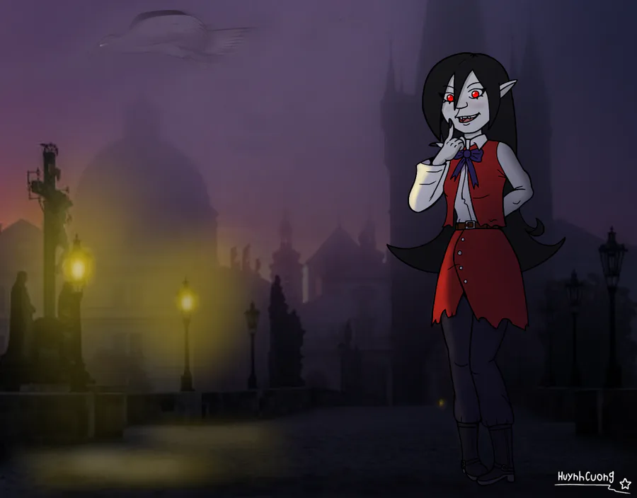 There's a girl in bridge prague, black hair, red eyes, her ears, teeth, red dress and black boots.