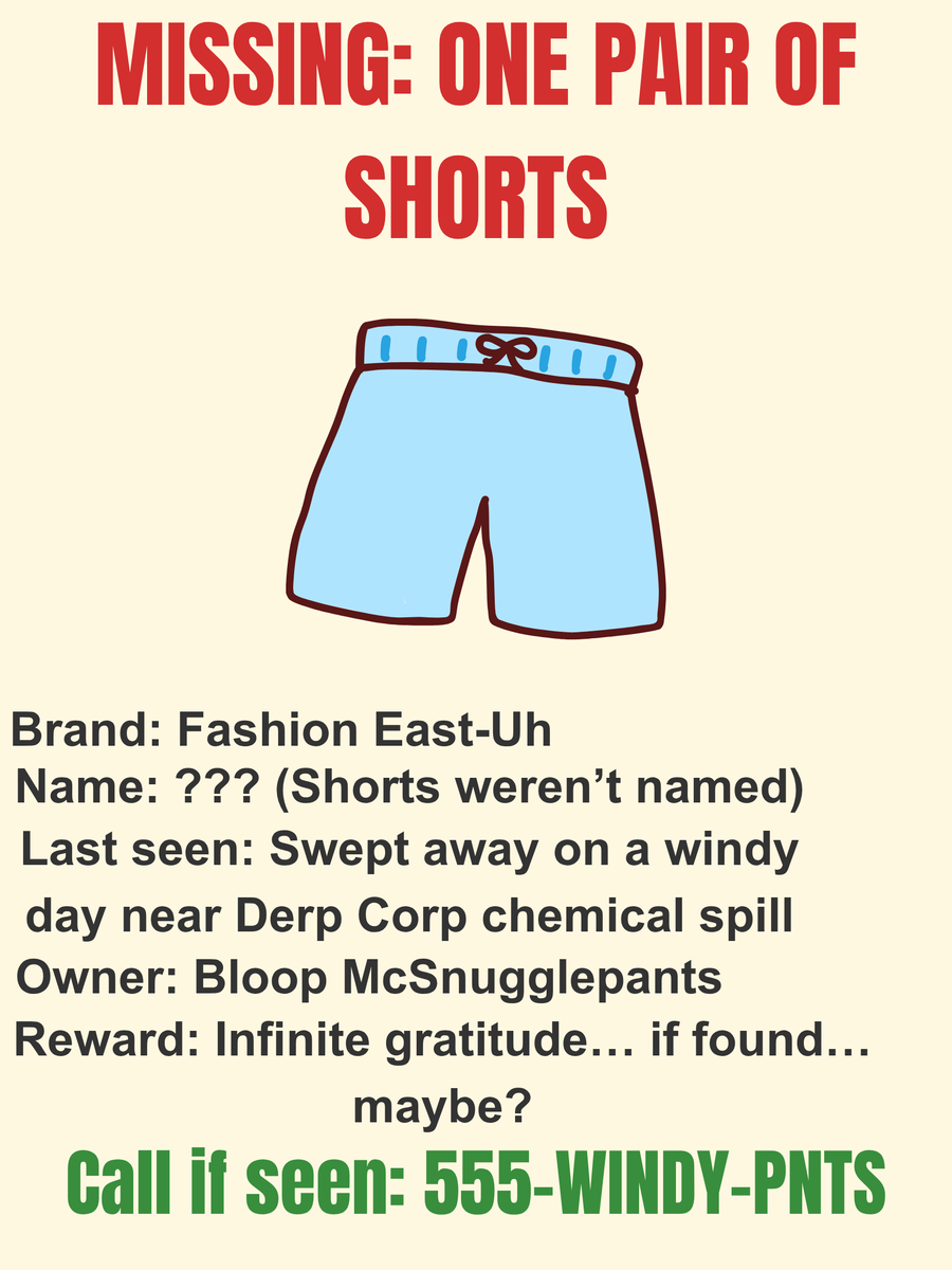 “Lost on a windy day… nobody knew what would happen next. Keep an eye out for these pants.”