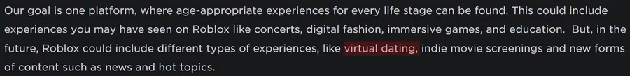 Roblox apparently could allow online dating onto their platform as stated on their "Our Vision for All Ages" blog post.