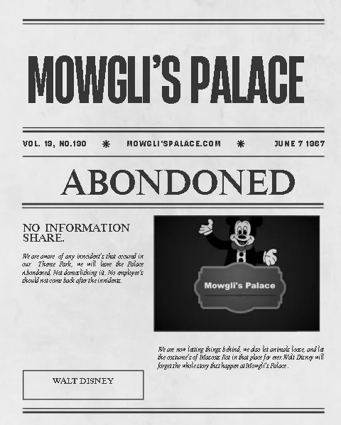 We sorry for the convenience on why Mowgli's Palace had too close it's doors, we will not be sharing any incidents on the place as our safety for our company. Please note no employee's or anyone allow too step in this place as the building stays abondoned