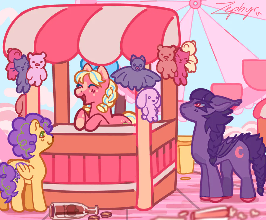 Lil scene of some of my mlp OC's! Candy Apple works at the county faire and sometimes Moonsong likes to keep her company :)