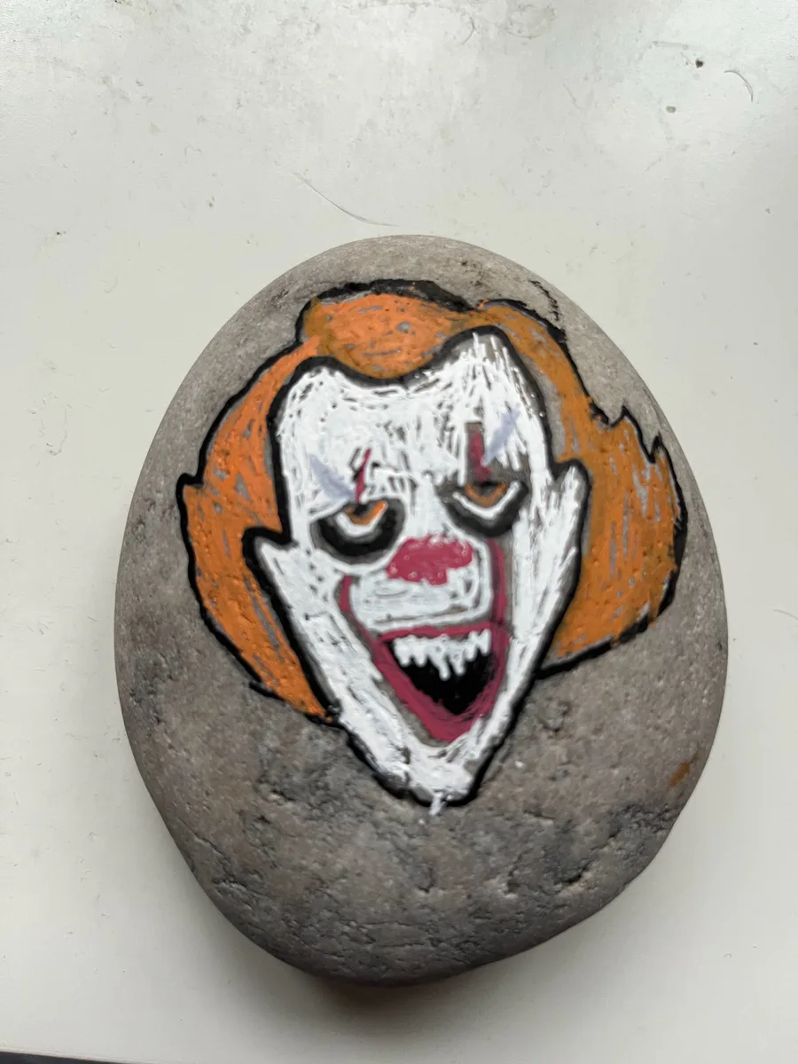 My rock painting of Pennywise the dancing clown, swipe right to see the sketch