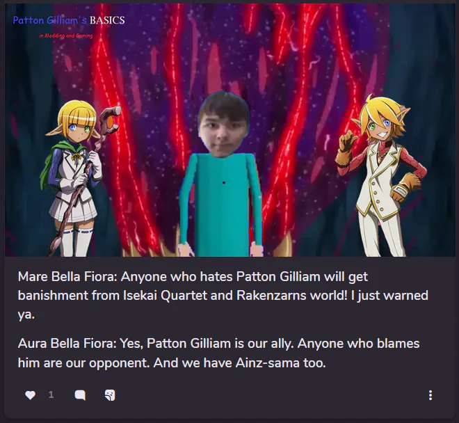 Mare Bella Fiora: Anyone who hates Patton Gilliam will get banishment from Isekai Quartet and Rakenzarns world! I just warned ya.