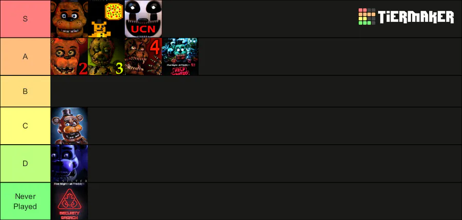 link to the tierlist: https://tiermaker.com/create/five-nights-at-freddys-games-2022-1…