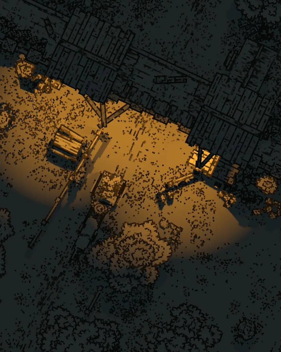 Monochrome pixel art: A merchant and a gate at night.