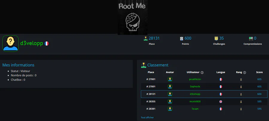 Here's why I'm posting less ^^ Rootme is a site for practicing/training cyber attacks and solving challenges in different areas (I'm doing 8 hours a day at the moment xD