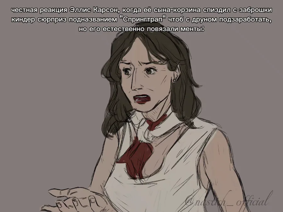 Loading...Перевод для англ: "Ellis Carson's honest reaction when her son (mama's boy) stole Springtrap, hoping to get rich with friend, but was caught and arrested by the cops:"