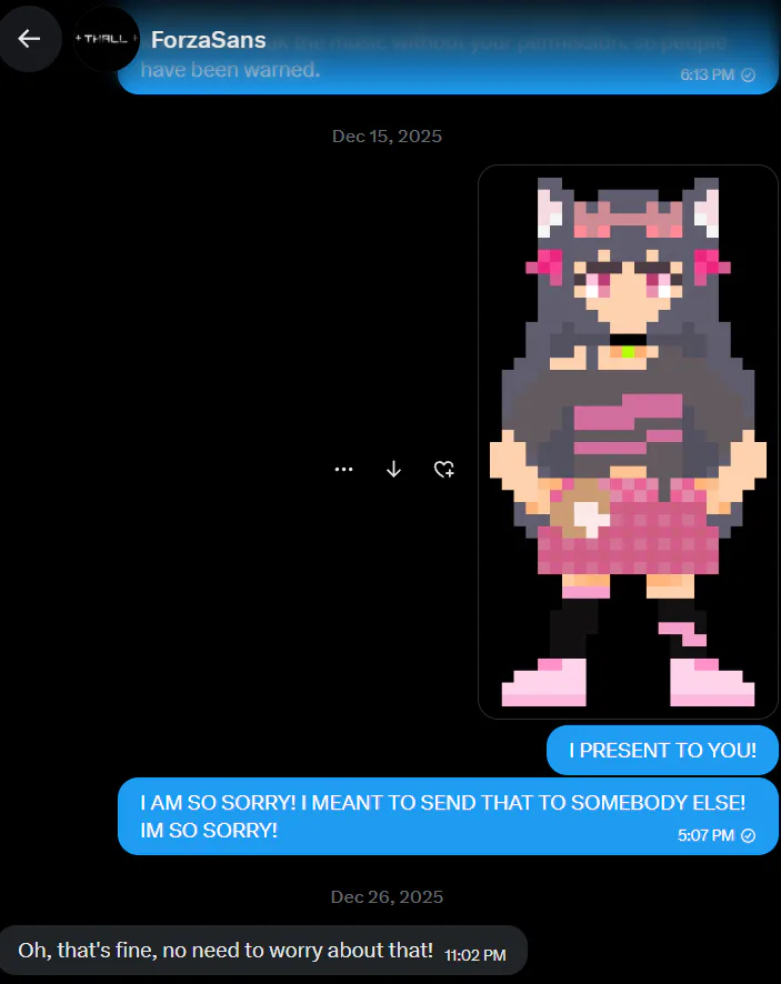 Scariest moment of my life holy shi- so i accidentally sent my almost complete Mari Yume sprite to somebody to show my progress, but i accidentally sent it to ForzaSans... very scary lmao.