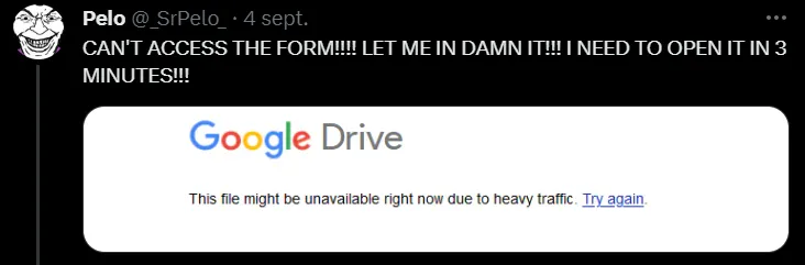 7 hours ago, a man has experienced the 5 stages of grief: Denial,Anger,Bargain,Depression,Acceptance in a matter of hours. If you do not want to see someones road to insanity due to a Google Form Page, viewer discretion is advised:https://www.youtube.com/watch?v=KxPxjT2T5E8&ab_channel=SrPelo