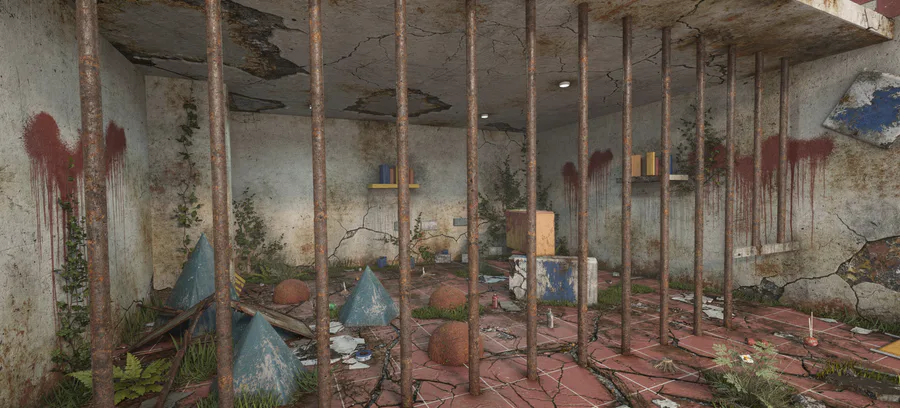 R: The evolution of visuals. Experiment with AI. Task: Turn the "cute children's center" into an "abandoned trampoline hell." This sets the game's style. Technically possible? Yes. Challenging? Absolutely. But now I see the direction. What do you think?