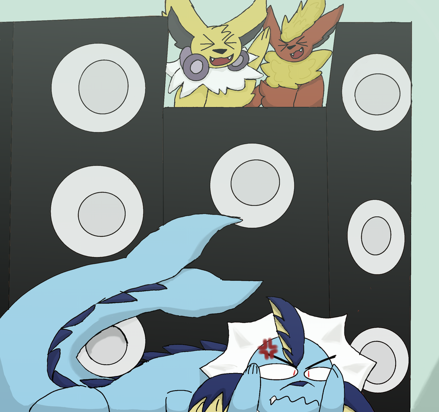 A drawing of Jolteon and Flareon annoying Vaporeon with a loud speaker.