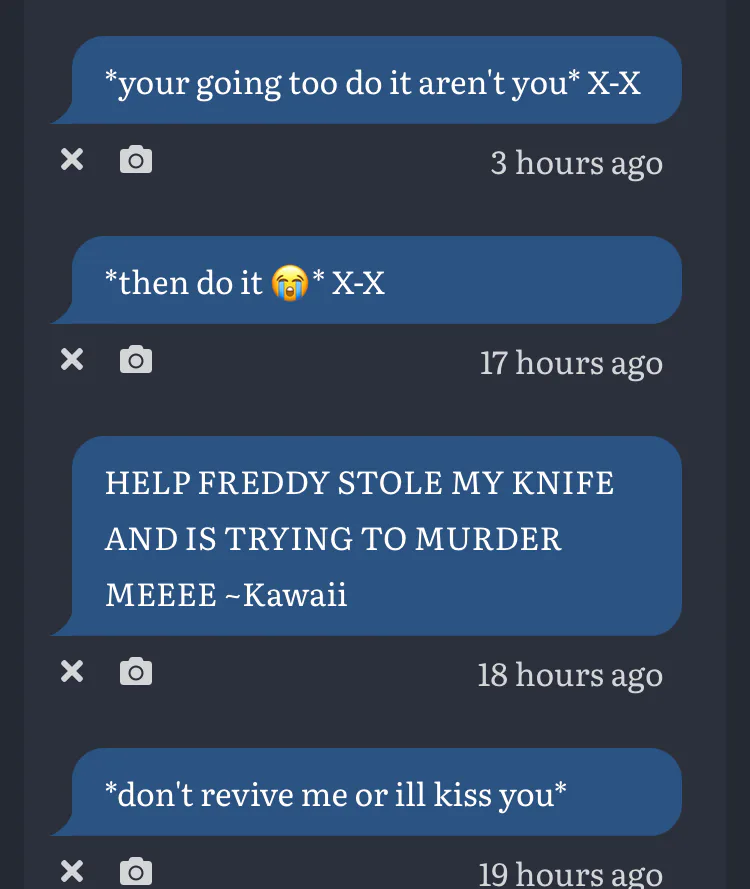 3: *I have Freddy’s head* I took care of him and here’s your knife *gives you back your knife*