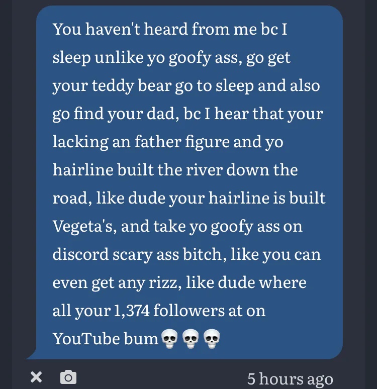 Bro you don’t even know what I look like so you can’t be talking shit about my hair line LOOK AT YOURSELF YOU FUCKING HATING FOR NO REASON I DIDN’T DO SHIT TOO YOUR BITCH ASS FUCKING FIX YOUR GRAMMAR DUMBASS