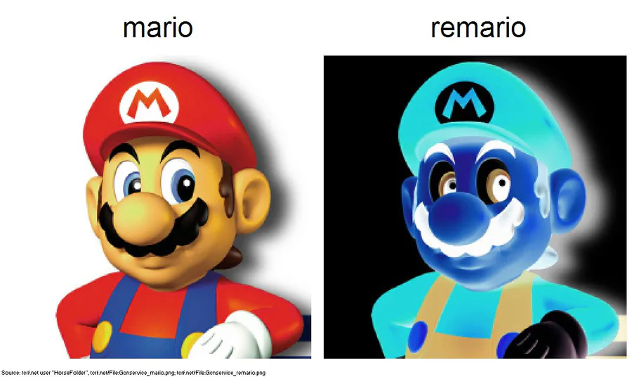 The GameCube Service Disc, used by Nintendo representatives to test and diagnose problems with GameCube systems, contains two images of Mario in its files: a regular render called "mario", and an inverted one called "remario".