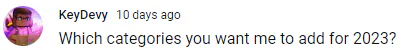 What categories you want me to add for 2023?