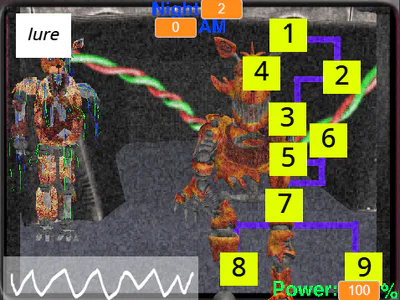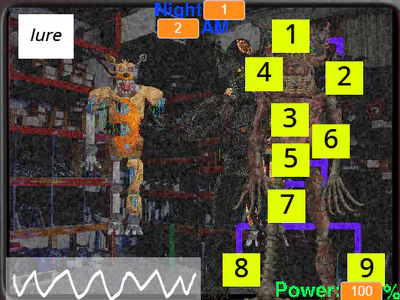 -The One True Tigy: Makes his way to your office, and cannot be stopped. Delay his onslaught by using the lure on the camera he is on. He doesn't like the lure, so it will deter him back to the start.