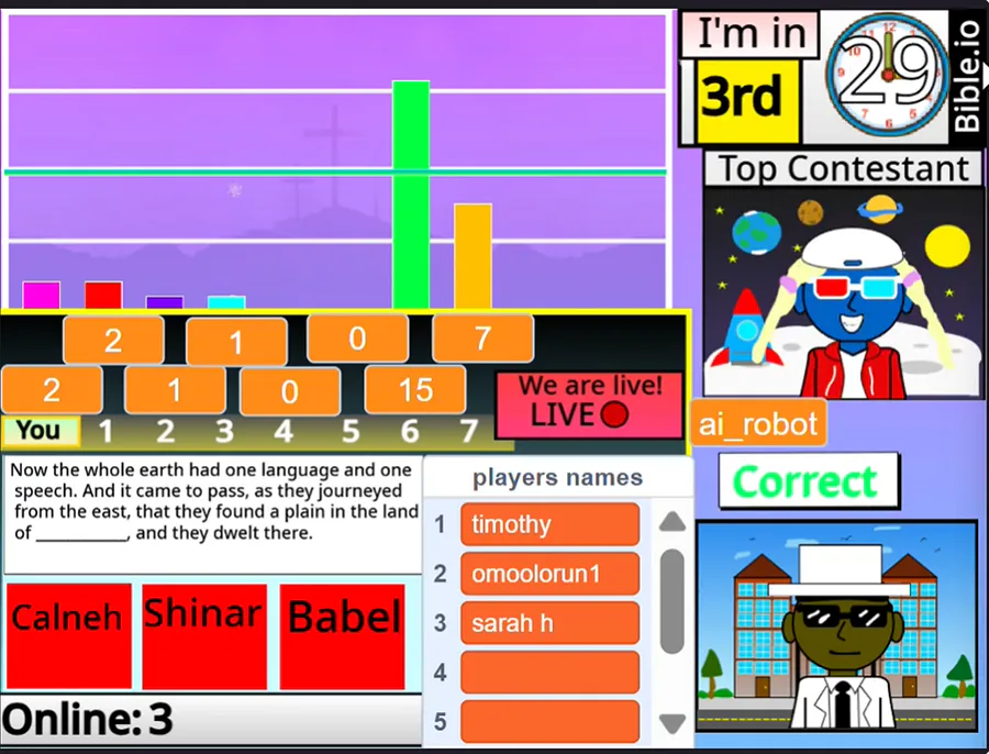 Hello everyone, welcome to Bible.io, also known as Bibleio. It is an online game where you answer questions from the Bible and you verse people, Bible Scholars, and Christians from all around the world. And compete on a global online leaderboard! Have fun as you learn more about God's word! Onward! This is actually the first online multiplayer Christian game that even exists in the world where you can compete with other people in real time! #multiplayer #online #Bible #Christian #Bibleio