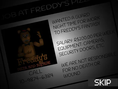 Freddy's Funland 2 Coming soon... ~~~~~~~~~~~~~~~~~~~~~~~~~~~~~~~~~~~~~~~~~~ Story: Welcome Jack to your new job at Freddy's Pizza and Arcade. You work from 12 am to 6 am. but you realize that something is wrong , Good luck and have fun. ~~~~~~~~~~~~~~~~~~~~~~~~~~~~~~~~~~~~~~~~~~ Green flag - return to Menu. Red button - close Door. big button - cameras ~~~~~~~~~~~~~~~~~~~~~~~~~~~~~~~~~~~~~~~~~~ how to play: Freddy:Mask Bonnie:Mask Chica:Mask Foxy:Flash ~~~~~~~~~~~~~~~~~~~~~~~~~~~~~~~~~~~~~~~~~~ They get faster in later nights, so be careful. It took about 2 weeks to make.