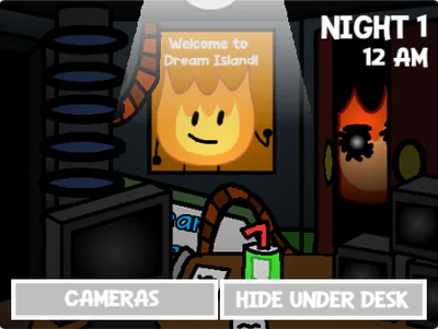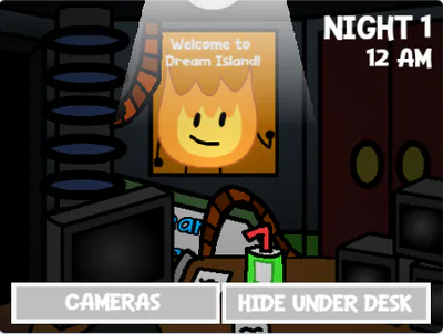 This game is basically just a parody fangame of a FNAF fangame series known as "Five Nights at Treasure Island" but with characters from a YouTube series known as "Battle for Dream Island", and I made this because it has been inside of my mind for a while now and plus since I really didn't see anyone else make a FNATI plus BFDI parody fangame, so yeah... but anyways, let's get into the story...