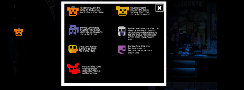 I know this has kinda been done before but this is my (awful) take on Flappy FNaF. Play as different characters from the FNaF series and chase high scores. If you have any questions don't hesitate to ask.