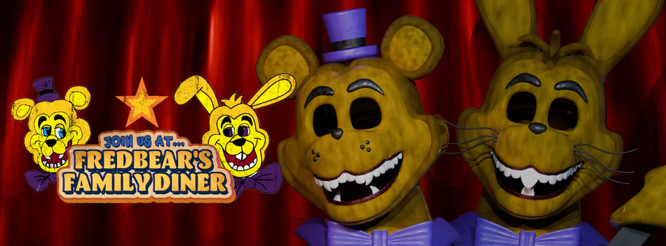 JOIN US AT FREDBEAR´S is a classic #fnaf Point-and-Click fangame where you are a nightguard in the new restaurant at Hurricane, Utha, Fredbear´s Family Diner, a Pizza place with 2 suit with a soo called "Springlock technology" and other 4 animatronic characters. Meet Fredbear, Yellow Rabbit (a.k.a SpringBonnie), Freddy, Bonnie, Chica and Foxy the pirate! The seamly friendly visitors that will come to you and give you a hug!