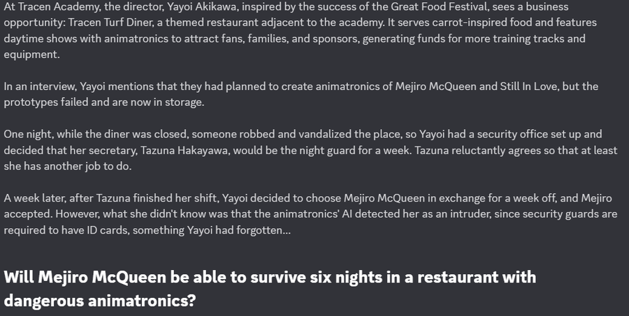 This fangame of FNaF is based on the anime/videogame: Umamusume