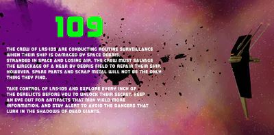 The crew of LRS-109 are conducting routine surveillance when their ship is damaged by space debris. Stranded in space and losing air, the crew must salvage the wreckage of a near by debris field to repair their ship. However, spare parts and scrap metal will not be the only things they find.