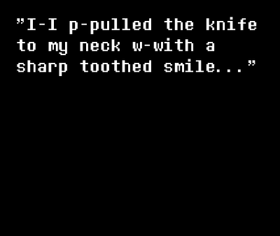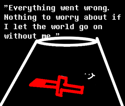 I don't know why... I should be in hell. Stabbing them in the neck, laughing... Erase the world, I wasn't the one in charge. Forced to by a demon, the pain was large. I had gone insane, killing just one turned me on, There is no excuse for my sins, I think I should just be gone. Realising the immense pain I caused, I see what the problem was... Wanting to do it again, I had to resist because I still had to repay my sins. !!WARNING!! Not exactly sure, but in the first release(s) of the game, there may be scenes of depression, mental breakdowns, anxiety and stuff like that.