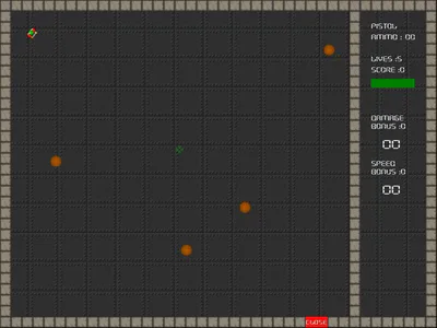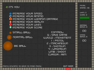 Control : WASD - movement,LMB - shoot/select,1234 - switch weapon,Q - save game,C - clear highscore,F4 - switch screen (normal/fullscreen),F9 - screenshoot,Esc - quit