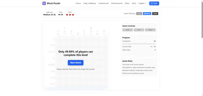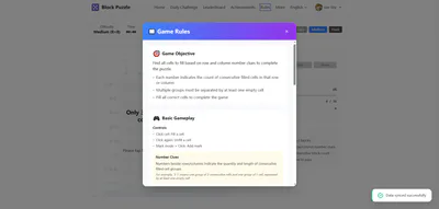 Block Puzzle is an onlineĀ logicĀ puzzle game based on Nonogram/Picross rules, where players use numerical clues on rows and columns to decide which cells to fill, gradually revealing hidden pixel art pictures. It offers three difficulty levels (5Ć5 easy, 8Ć8 medium, 10Ć10 hard), daily challenges, leaderboards, achievements, and cloud save, and can be played for free on mobile, tablet, and desktop to train logical thinking and concentration across all ages.#Puzzle #Logic #Nonogram #Picross #WebGame #Casual #BrainTeaser #SinglePlayer
