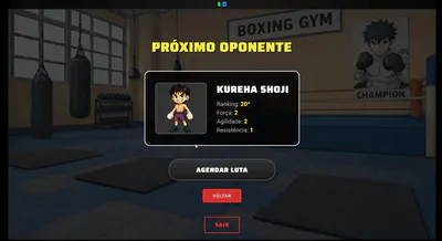 Jogo de Boxe em RPG por turnos, inspirado pelo aclamado anime Hajime no Ippo. Crie seu lutador, melhore seus atributos, lute e suba os degraus do ranking um à um. Se quiser, teste sua coragem no torneio Clandestino, entre em brigas de rua, crie novos laços, cultive amizades, amores. Tudo enquanto trilha seu caminho até o topo do mundo. #rpg #boxe #boxing #hajime_no_ippo #hni #tale #manager #indie