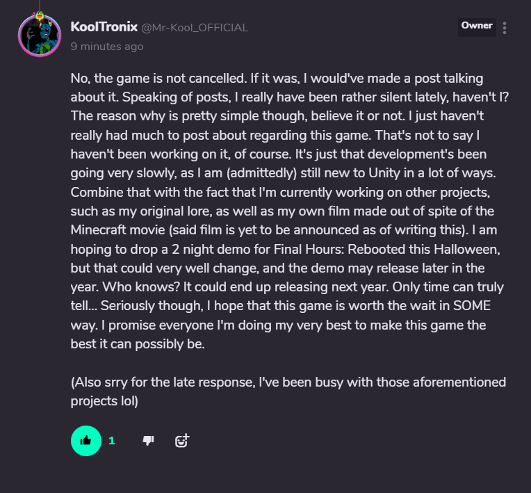 (formerly known as Phan_K_Games). Said series was pretty short lived sadly, as Aidan cancelled the series about midway through development of the 3rd game due to issues he had with the story, as well as the fact that he wanted to move on to more non-FNaF projects. Despite that, the Final Hours games have always been some of my favorite FNaF fangames, simply because of how unique they are to me. The oddly fitting lofi and synth music, the over-the-top jumpscares, the strange yet charming original characters, as well the overall vibes and atmosphere just work for me.