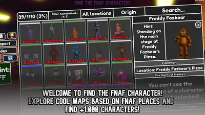 Find The FNaF Character is a badge hunt game on Roblox. Your main objective is to collect characters all over the map, from the classic Freddy Fazbear, to the least known character, a lot of familiar faces can be found in this game!