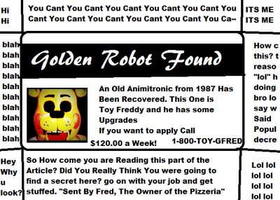 Uh...Hello? Hello? Welcome to the old location of Freddy Fazbears Pizza! Bonnie,Chica and Toy Foxy is gone... but we have the Marionette and balloon boy. we also found toy freddy. we painted him gold. the 3 do tend to be...active at night. its a free roaming mode. there are rumors about a man killing 5 children in this place. the safe room camera should be active.. if it isnt.. well then we have to fix that camera again. overall. it would be safe... if the animitronics didnt force you in a Golden Toy Freddy Suit. which has mechanical wireing in the suits. there are some springlock suits in the saferoom. noone should touch those. and we also have the mask. remember...put on the mask. and wind up the music box. Simple,Right? Well. thats all you need to survive the nights! goodnight.