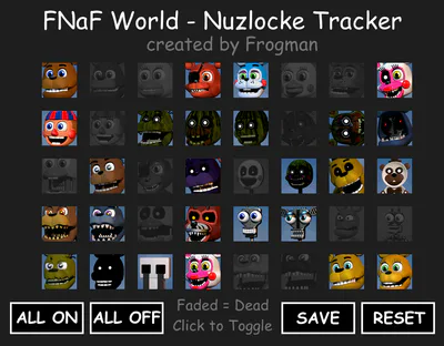 I've seen lots of different people attempt FNaF World Nuzlockes, and usually the way they go about listing who is dead is by using either a Notepad, or removing the character from the save file. The latter causing an issue where you will re-encounter them... it gets messy! So, I made this program for anyone to use to properly keep track of your Animatronics! :)