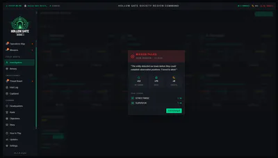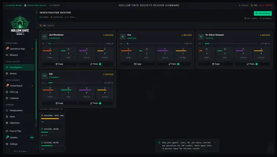 You are seated inside the Hollow Gate operations center, monitoring live field deployments against supernatural incursions. Your investigators enter hostile environments. You watch the feeds. You interpret the signals. You decide what happens next.