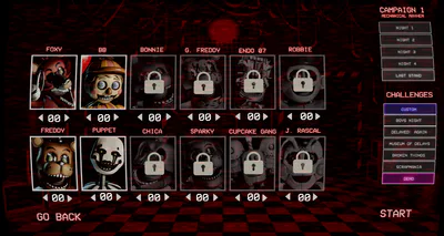 A menu for selecting animatronics to configure their difficulty levels.